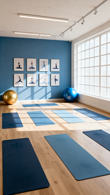 蓝白双色简约瑜伽空间,木质地板与光影交织,扁平风插画墙饰营造清新舒适感,木雕质感细节呼应自然柔和氛围。
