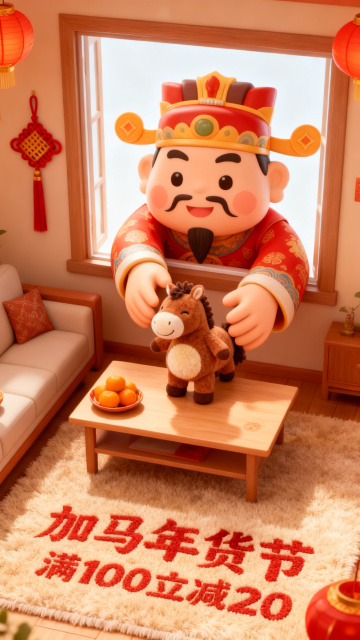 软3D国潮风,卡通财神手持萌马,喜庆氛围拉满,搭配年货节促销信息,粘土质感与节日元素融合,传递温馨与好运。