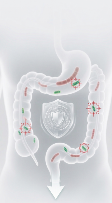 写实风格女性腹部特写,双手轻柔交叠于下腹部,浅肤色肌肤细腻光滑,白色贴身衣物简洁纯净,半透明蓝色肠道器官解剖示意图以柔和线条勾勒于腹部中央,内部点缀细小蓝色光点,周围环绕多个大小不一、具有通透感和高光反射的蓝色圆形气泡,整体画面呈现出医疗健康领域的专业、洁净与科技感,光线柔和均匀,背景为纯白色,营造出清新、专业且略带梦幻的氛围。