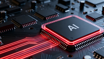 深蓝色背景上,以电路板纹理为基础,中央矗立着巨大的、立体发光的蓝色"AI"字母,字母内部有精细的电路纹路,周围环绕着流动的蓝色光效和闪烁的星点粒子,整体呈现出赛博朋克风格的科技感与未来感,具有强烈的视觉冲击力和深度感,营造出神秘而先进的氛围。