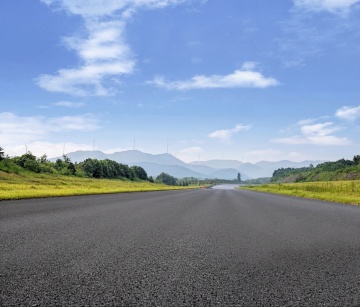 蜿蜒的沥青公路向远方山脉延伸,两侧是郁郁葱葱的绿色植被和金属护栏,晴朗的天空中飘着洁白的云朵,阳光明媚,呈现出印象派绘画风格,色彩明快,笔触富有动感和层次感,光影变化柔和,营造出宁静而充满希望的氛围。
