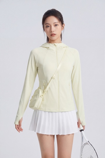 三位充满活力的年轻人在开阔的城市平台上向前奔跑,姿态轻盈舒展,充满动感与喜悦。画面采用明亮清新的摄影风格,主色调为湛蓝的天空、洁白的云朵与人物运动服的紫色、灰色、米色等活力色彩,光影明亮柔和,阳光从上方照射形成清晰自然的阴影,凸显出人物的立体轮廓和运动的动态感。背景可见远处模糊的城市天际线,地面是灰色带有白色线条的铺装,整体构图开阔舒展,充满积极向上的氛围。人物穿着现代运动服饰,包括运动夹克、短裤、运动鞋和帽子,展现出健康活力的运动风尚,画面传递出青春、运动、自由与快乐的情感。