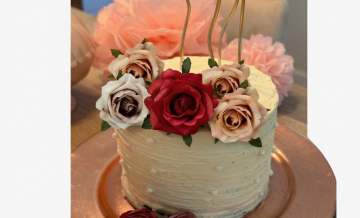 一个奶油蛋糕放置在浅色木质桌面上,蛋糕中心装饰干玫瑰碎,酒红色干玫瑰花瓣自然散落在桌面,整体氛围温柔浪漫,风格为写实美食摄影,光影柔和通透,突出蛋糕细腻质感与干玫瑰的自然纹理,整体色调温暖治愈,干净简洁,纯视觉呈现,无多余文字。