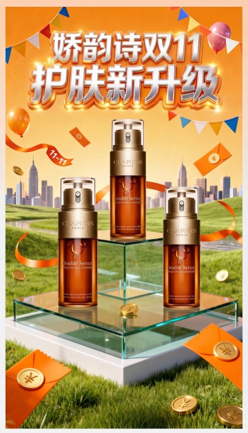 红金3D促销风设计,透明精华液瓶与灯笼元宝等年货元素结合,营造热闹年货节促销氛围