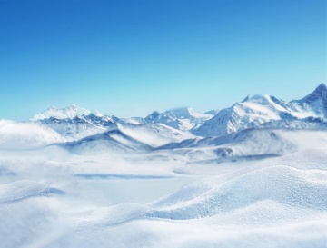 超写实摄影风格的雪山湖泊全景,纯净的蔚蓝色渐变天空与白雪覆盖的连绵山脉形成鲜明对比,前景是冰封湖面呈现出清晰的山脉倒影,山间萦绕着淡淡的薄雾增添层次感。画面整体采用高清晰度、细腻的光影处理,阳光从侧上方照射形成柔和的阴影过渡,雪山表面的纹理与冰面的裂痕细节清晰可见。轻盈的雪花从天空中缓缓飘落,部分雪花点缀在近景的冰面上,营造出宁静而圣洁的冬日氛围,色彩以蓝白为主色调,整体构图遵循三分法,保持画面的平衡与开阔感。