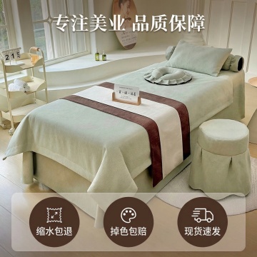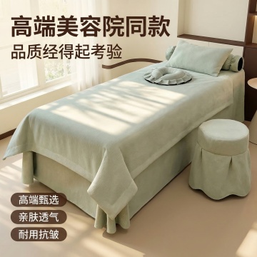 基于提供的美容床罩图片,生成电商主图1:风格为简约高级美容院风,暖调自然光;床罩主体与原图一致,背景为奶油风美容院空间,包含米白墙面、浅米色地毯、白色推车、落地灯与绿植,柔和自然光从右侧洒入;左上角文字主标题「舒适升级 美容院专用床罩」,副标题「兼顾质感与实用」,金底白字标签「四件套配齐」;右下角竖向排列卖点「✓ 亲肤透气 ✓ 垂坠有型 ✓ 防滑不跑动」,字体为无衬线粗体白色,文字不遮挡产品主体,整体通透高级。