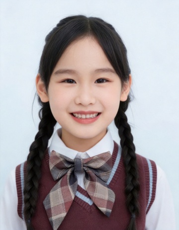 将模特头上的白色蝴蝶结发箍替换为右侧的1厘米粗的深棕色扭辫发带,佩戴在原本发箍的位置,与模特的发型自然融合,保持图片整体风格、光线、背景不变