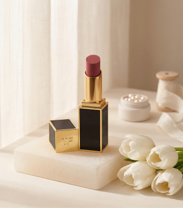 金属质感外壳搭配高光泽红唇膏,重拟物风格呈现奢华优雅,实景光影强化时尚感,节日氛围尽显精致魅力。
