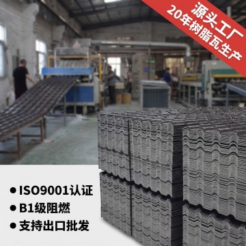 工业风实景拍摄,金属质感树脂瓦堆叠,突出体积感与现代科技感,融合印刷风设计元素,传递源头工厂20年专业生产实力与商务信赖感。