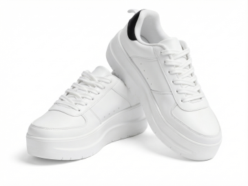 将原图模特脚上的鞋子替换成第二张参考图里的全白色板鞋,高度还原新鞋子的细节和颜色,同时在模特的白色袜子上添加第三张图的EMPORIO ARMANI鹰形logo,保持整体场景和光影不变