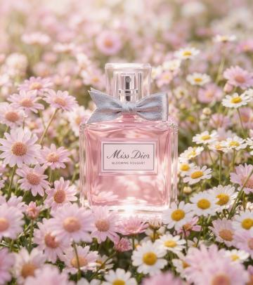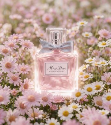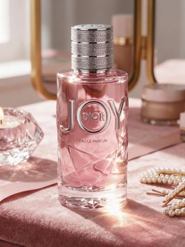 唯美感与浪漫感交织的3D重拟物风香水场景,玻璃瓶身透出柔和光影,玫瑰花瓣环绕,营造清新优雅的实景氛围。