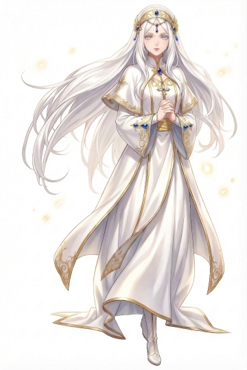 插画风动漫角色,白发金饰,圣洁长袍,鎏金细节,神圣与梦幻交织,古典优雅中透出唯美感。