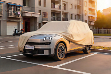 现代感与科技感交织,3D风重拟物设计,金属质感车身包裹银色车衣,荧光绿线条勾勒未来轮廓,光影交错间尽显未来感与实景感。