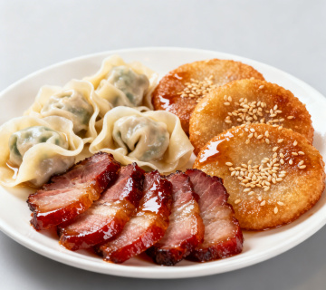 一张白色圆形瓷盘盛放的中式菜肴,菜品色泽红亮诱人,表面覆盖光泽感的酱汁,点缀细小的红色辣椒碎,食材形态自然堆叠,具有清晰的质感和细节,纯色白色背景,简约现代风格,整体构图规整居中,无任何文字、logo或水印