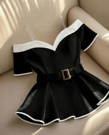 将第一张图的衣服替换成第二张图的黑色宽肩带露肩短袖收腰裙摆款式,保留人物、背景和整体色调不变