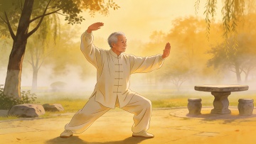 5组白发老年人在打太极拳,他们身姿挺拔,动作舒展协调,脸上带着平和的笑容,背景是青山绿水,整体采用扁平插画风格,色彩明快柔和,线条简洁流畅,人物服饰为传统太极服,画面充满宁静和谐的氛围