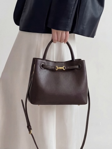 简约主义与双色设计风融合,灰色真皮搭配鎏金金属扣,光影感柔和,呈现优雅奢华的现代商务时尚。