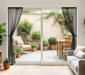 明亮简约的室内空间,不同角度展示的各式窗户,窗框设计简洁,搭配可调节的白色百叶窗,部分叶片打开,透过窗户能看到窗外郁郁葱葱的绿色树木和明媚的自然光,光线在浅色木地板上投下百叶窗的条状光影,窗边摆放着茂盛的绿色植物,整体氛围清新自然、宁静舒适,展现不同场景和布置下窗户与室内环境的和谐融合。