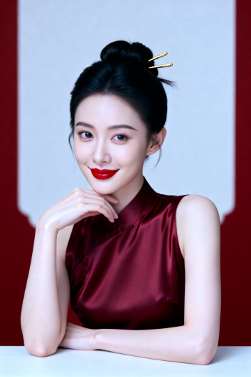 一个黑色旗袍的女生,竹子,正面,红色背景