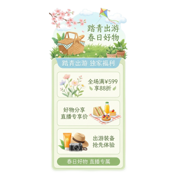 软3D风卡通人物置身樱花纷飞的超市场景,融合清新梦幻的春季氛围与促销信息,营造可爱温馨的购物体验。