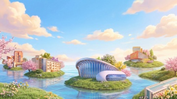 七夕主题背景图,粉紫色氛围,画面下端中心有一座古风拱桥,俯视视角,桥下有很多立体云朵,其中一两朵为爱心形状,上半部分是天空,天空中有星星和喜鹊,3D立体画风,高清摄影,8K,光影效果,写实感
