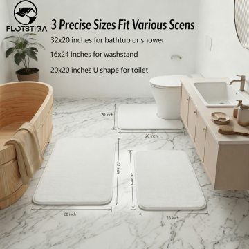 只替换图片中三块地垫的颜色为橙色,浴室场景、浴缸、洗手台、马桶、植物、尺寸文字标注以及瓷砖地面等其他所有内容都保持原样不变