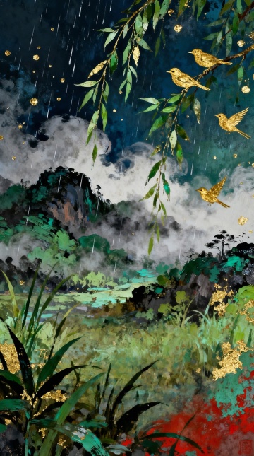 水彩风格的森林景观,画面整体呈现宁静悠远的氛围,远处是朦胧的树木剪影,近处是湿润的地面和水洼,光影柔和,色彩以清新的青绿色为主调,搭配淡雅的蓝色和白色,营造出雨后森林的清新感,笔触轻盈,具有透明晕染的质感,构图采用竖版布局,视觉引导线从近处的水洼延伸至远处的树林,留白恰到好处,增强画面的空灵与静谧。