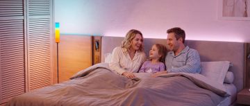 在图中左侧落地灯的右边添加一个外国面孔的小男孩和他的父亲,两人目光注视着落地灯,面带微笑,小男孩手上拿着一张纸,保持原图整体风格和其他内容不变