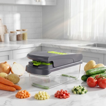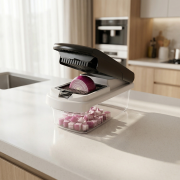 超逼真电商细节拼贴图,手动蔬菜切碎器,包含方形刀网、黑色按压盖结构和透明收纳容器的微距特写,干净白色背景,高级产品细节展示,高细节塑料纹理,金属刀片清晰反光,有序的多细节构图,和参考产品设计一致,摄影棚灯光,超逼真产品摄影,干净电商风格,现代美式厨房美学,柔和自然采光,高细节,清晰对焦,真实材质,准确比例,黑白手动蔬菜切碎器配透明容器,无Logo,无水印,无额外配件,不变形,产品完整不裁剪,无文字。保持所有产品部件设计和配色和参考一致,商业高调摄影,结构清晰细节锐利。