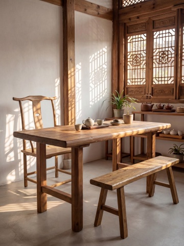 明亮温馨的日式原木风格餐厅内部,浅木色餐桌搭配米色布艺餐椅整齐排列,天花板悬挂简约白色纸质灯笼吊灯,墙面装饰浮世绘风格挂画,窗边摆放茂盛的竹制绿植,地面铺设浅色木质地板,阳光透过木质格栅窗洒入室内形成柔和光影,餐桌上摆放素雅的陶瓷餐具和白色餐布,整体营造出自然、宁静、舒适的用餐氛围,具有清晰的视觉层级和高效的空间利用,符合日式美学的简约与禅意。