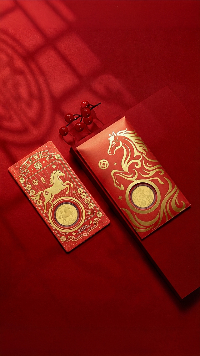 国潮风与复古纹样交织,鎏金烫印马年红包呼应喜庆红底,重拟物饼干跃出礼盒,印刷质感强化节日仪式感。详情