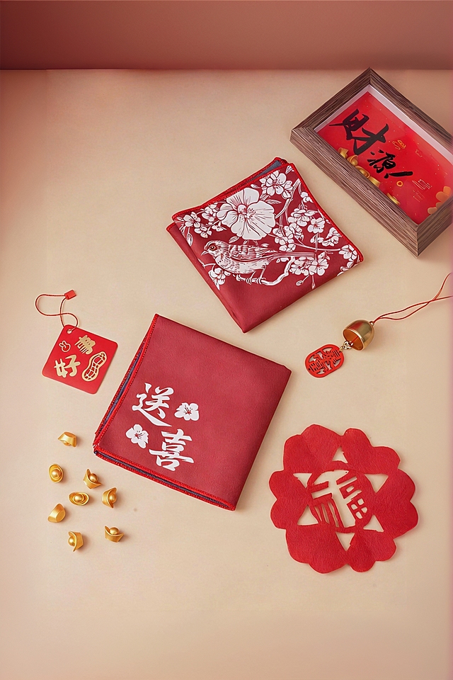 主体是红色台面上放着的图示商品,呈打开状态,内部商品向外飞溅。金色丝带围绕商品向上延伸,点缀金箔闪粉和红灯笼。正红色背景详情