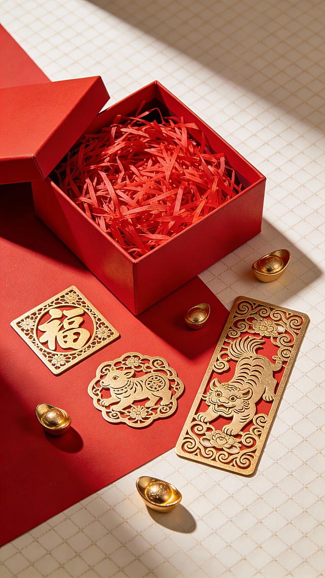 红金配色,浮雕质感,国潮风礼盒设计,融合祥云、灯笼与“福”字元素,尽显中式喜庆与鎏金华美。详情