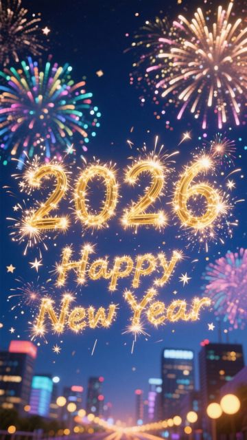 霓虹灯风与粒子风交织,大字风“元旦快乐2026”在梦幻光影中绽放,喜庆烟花升腾于夜空,虚拟现实感十足的节日氛围。
