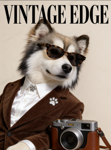 时尚感十足的杂志风封面,以双色设计与高级面料质感呈现,边牧身披红色大衣,尽显优雅格调。