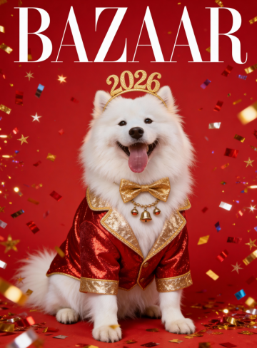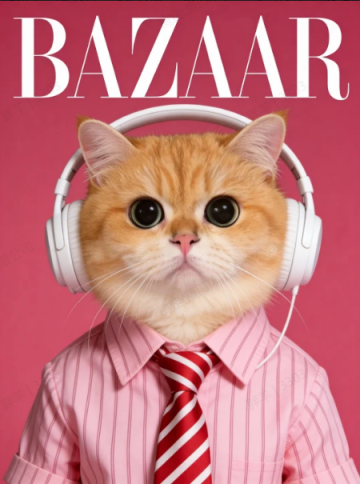 拟人风猫咪身着粉红条纹衬衫与红白领带,佩戴耳机,尽显时尚感与可爱感,双色设计风搭配杂志风构图,实景感十足,呈现《BAZAAR》封面的高级趣味。