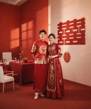 国潮风剪纸元素点缀,复古红金配色营造喜庆氛围,刺绣纹理毛衣呼应中式美学,温馨情侣依偎,尽显新年团圆暖意。