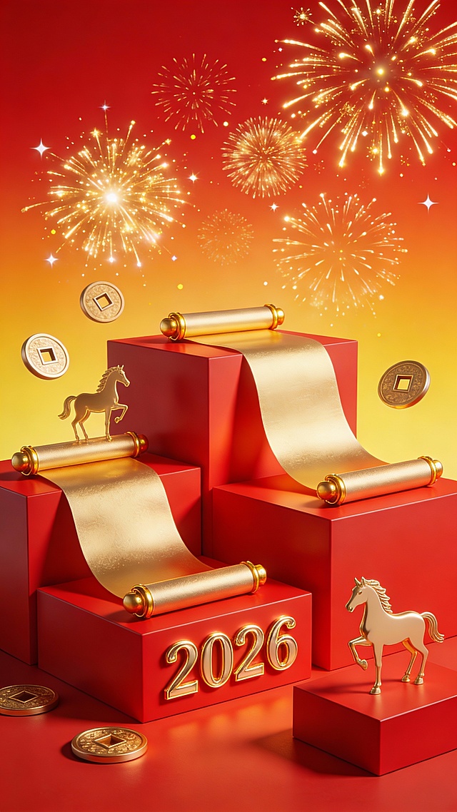 喜庆红金配色,3D大字“2026”鎏金边框,浮雕祥云环绕,烟花绽放,中式年味浓厚,新春贺岁氛围十足。详情