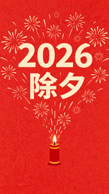红色背景搭配扁平风设计,大字“2026除夕”居中突出,上方烟花绽放,下方点燃的灯笼式蜡烛喷射出烟花,营造喜庆氛围,印刷质感强化节日视觉。