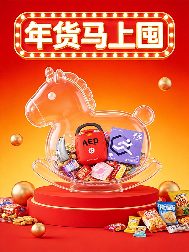 软3D风+国潮风融合,梦幻粉色云朵与马年剪影跃动其间,喜庆灯笼、烟花点缀,粘土质感零食环绕福字礼盒,营造出童趣十足的年货节氛围。详情