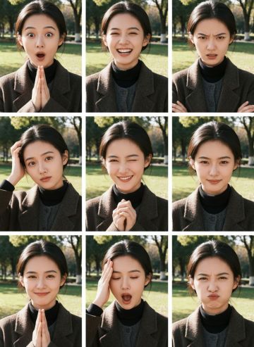 生成一个由9种不同镜头拍摄的“电影联系表”形式的九宫格,不要有明显分界线,拍摄的是参考图这一拍摄对象在冬日雪景公园散步,阳光洒落,色调温暖,不同景别、视角或动作。