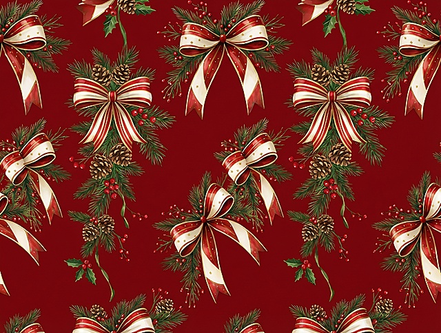 深墨蓝背景烫金暗纹,重复排列驯鹿角装饰的松枝环(红浆果)、鎏金铃铛,配银白雪花,奢华节日无缝纹样详情