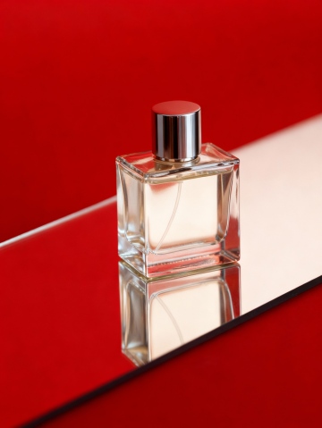 现代感玻璃瓶身,几何线条简洁利落,镜面反射增强清透与优雅,柔和粉调背景衬托时尚氛围,简约主义美学尽显高级质感。