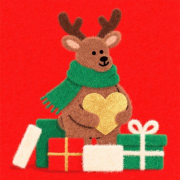 毛发生长风与刺绣风结合的软3D插画,萌趣驯鹿怀抱礼物盒,点缀雪人与铃铛,温暖橙色背景烘托圣诞喜庆氛围。