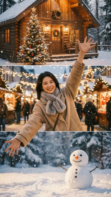 温馨冬日氛围,梦幻雪景与卡通雪人交织,拟人化手势传递可爱感,实景与粒子飘雪融合,营造节日温暖。