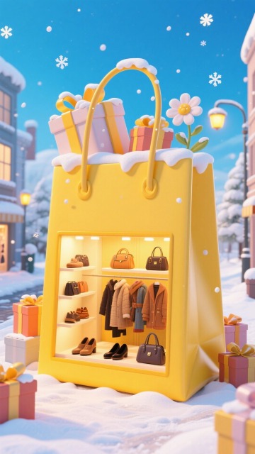 梦幻感与温馨感交织的冬日街景,巨型黄色购物袋化作微缩时尚橱窗,融合3D风与软3D质感,呈现潮流穿搭与节日礼物的甜蜜碰撞。