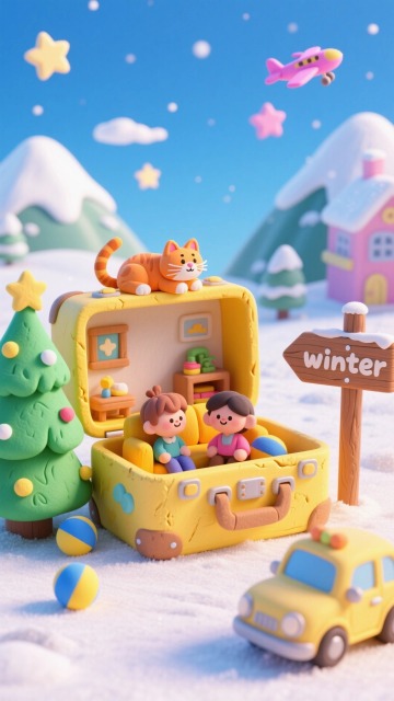 软3D风格,卡通人物与雪人共舞雪景,大字风标题呼应冬日主题,梦幻清新中透出温馨趣味,虚拟现实感十足。