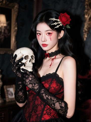 哥特风少女手持骷髅,红黑双色蕾丝裙搭配骨冠与血泪妆,复古油画质感,皮影式光影营造神秘惊悚氛围,万圣节主题视觉。