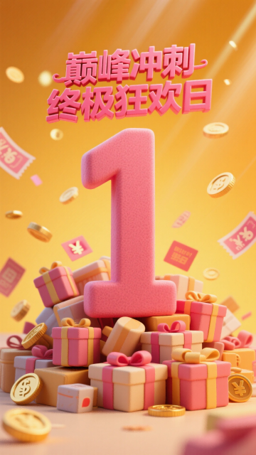 软3D粘土风设计,粉色巨“1”矗立礼盒堆中,金币红包纷飞,波普色彩碰撞,营造梦幻喜庆促销氛围。
