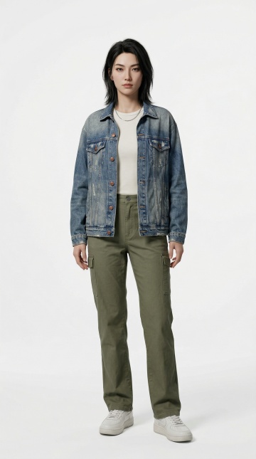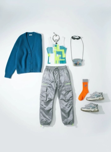 一个高级感欧美模特单膝跪姿,穿着图片上的穿搭,张扬时尚的姿势,纯色背景,(不同于图片片上模特的长相和姿势)